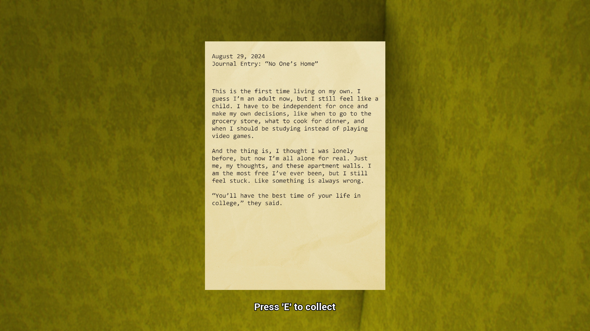 I was immensely inspired by the Backrooms games. The feelings of dread, isolation, and an eerie sense of nostalgia greatly resonated with me and how I viewed my mental state over the past few years. The main message of the game is that we all have struggles from the past that weigh on our minds, and if left unchecked, they can create a prison of shame and regret. Nowadays, many people face mental health issues, so it’s important to understand how serious it is, as well as to let people know that they’re not alone by sharing some of my past hardships with them (the notes in the game are based on real events in my life).